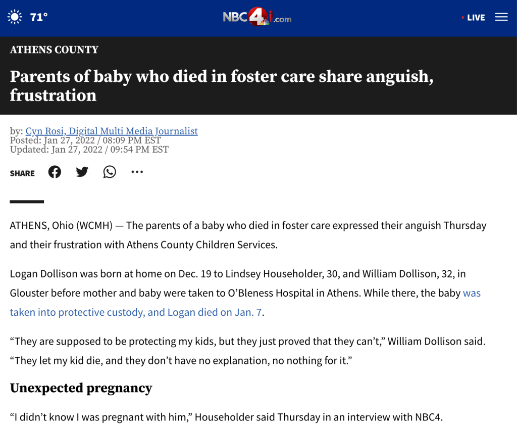 This story came to me from a source I’d been talking with for a year. She knew I’d show compassion to a young family who’d just been through tragedy. After speaking with the couple on a snowy day in rural Ohio, I verified their story through Athens County Children Services as well as the sheriff and county coroner’s offices.
