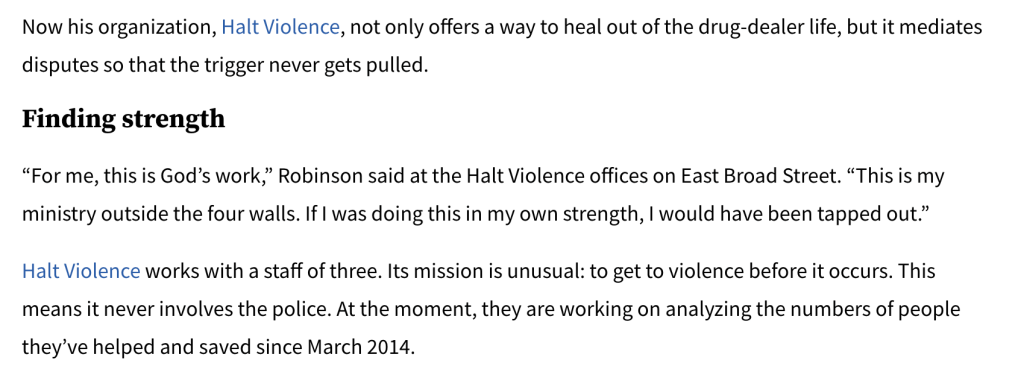 After I told the story of a woman whose son was shot riding a scooter, Thell Robinson contacted me at NBC4 about the work of his organization Halt Violence. This quiet, soft-spoken man served time in prison, but now he negotiates ceasefires between rival groups on the streets of Columbus. He shared the motivations which keep him going against all odds: a desire to give back to his community, a remembrance of his ancestors, and a deep and consistent faith.